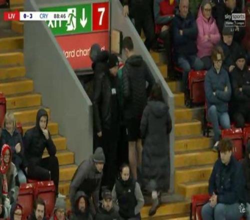 在第88分钟,利物浦已经少打一人且0-3落后于水晶宫,转播镜头给到安菲尔德球场现场观战的球迷时,已经有不少球迷提前离开看台。