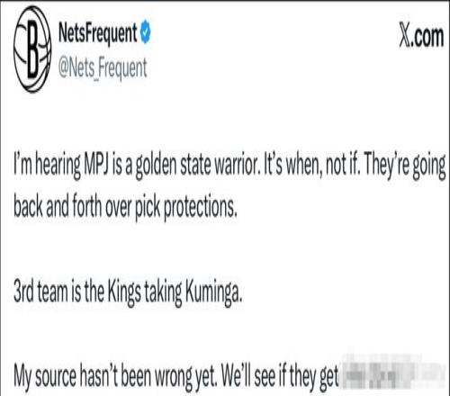多个篮网方面的消息人士在X上透露,小波特即将加盟勇士