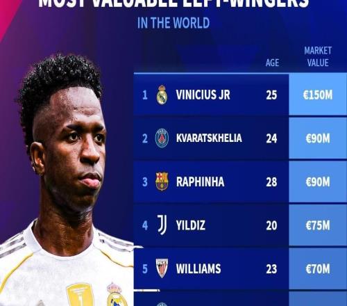 在完成最新一次身价更新后,德国转会市场网站列出了世界足坛左边锋身价榜,维尼修斯以1.5亿欧居首,克瓦拉茨赫利亚、拉菲尼亚紧随其后。德转列世界足坛左边锋身价榜1. 维尼修斯